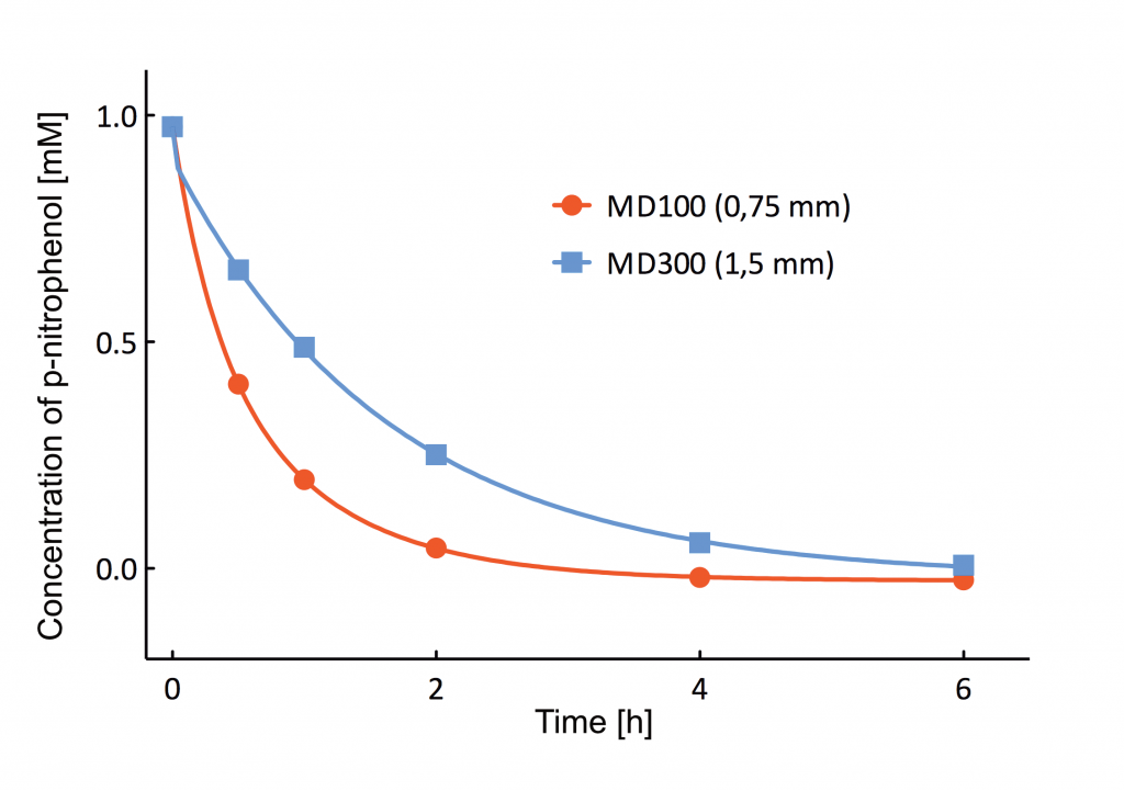 The dialysis time increases exponentially with the diffusion path. Therefore, a dialysis device with short diffusion distances should be chosen. For example, the scienova Xpress dialyzers have a specially developed geometry that guarantees high dialysis speeds. Shaking or stirring the solutions increases the transport of the compounds.