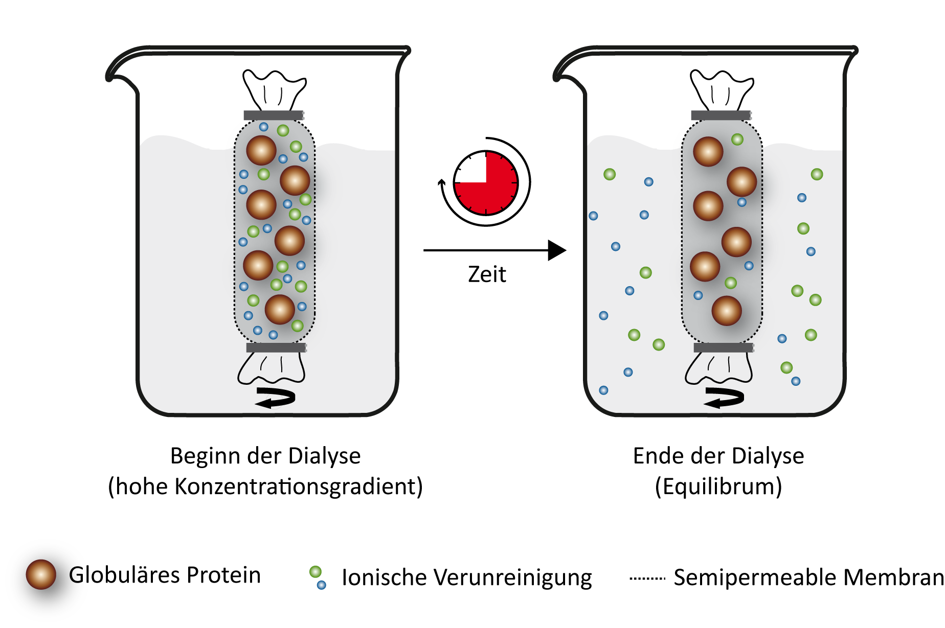 Die Verwendung von Dialyseschläuchen ist die klassische Methode zur Durchführung von Probendialysen im Labor. Entsprechend des Probenvolumens kann die Länge des Schlauches individuell angepasst werden und durch Verschlussklammern verschlossen werden. Die Probe wird gegen den Dialysepuffer der Wahl in einem Becherglas dialysiert. Die Dialysezeit kann durch mehrmalige Pufferwechsel beschleunigt werden.